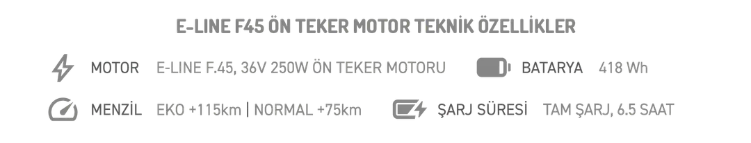 - Motor Ünitesi: E-Line R.45, 36V 250W Ön Teker Motoru